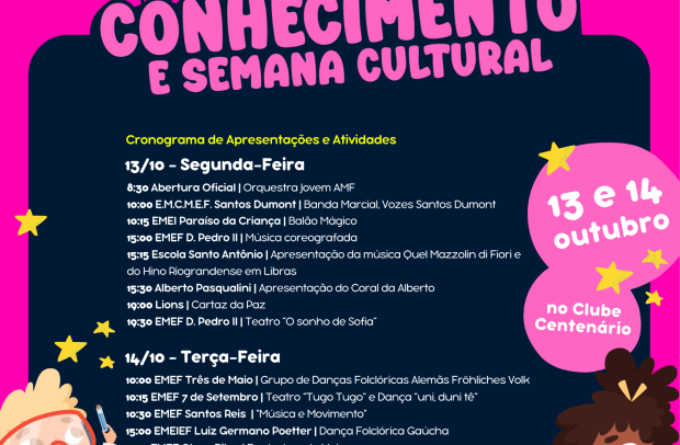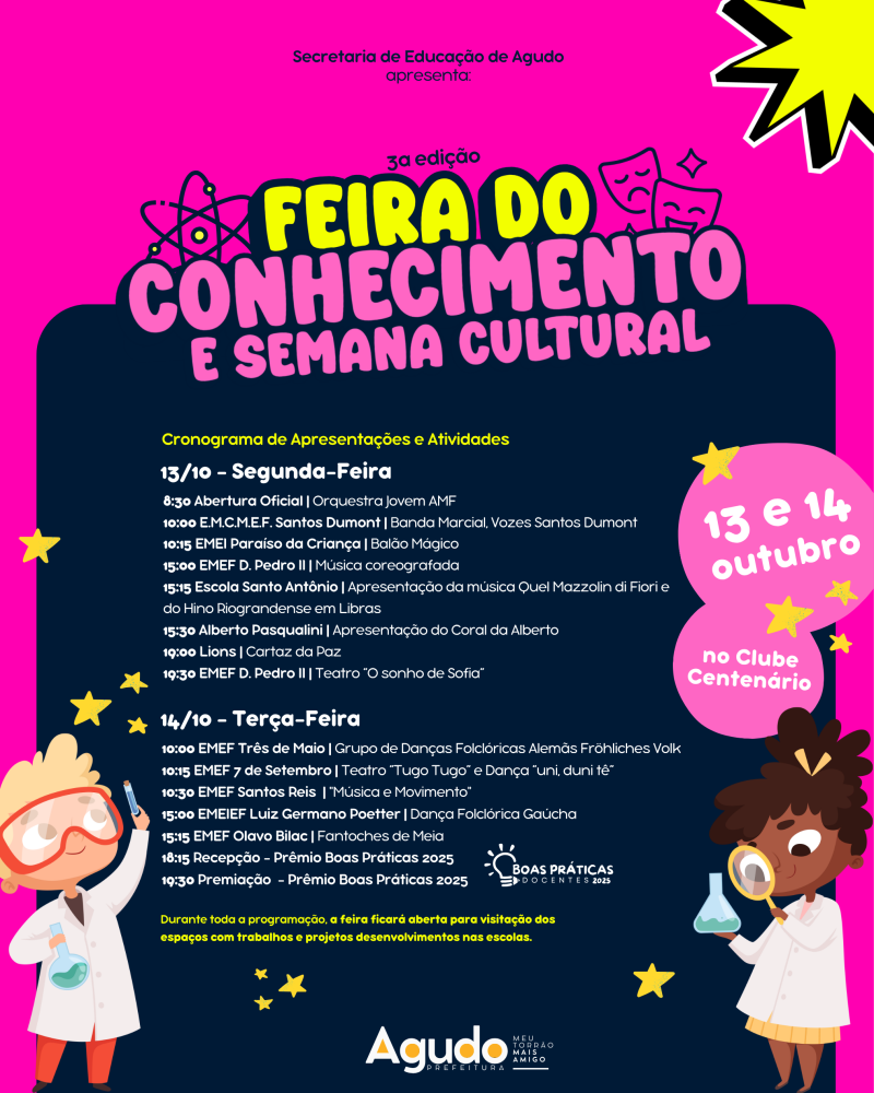 A Secretaria Municipal de Educação de Agudo promove, nos dias 13 e 14 de outubro, a 3ª Edição da Feira do Conhecimento e Semana Cultural, evento que já se consolidou como um espaço de integração e valorização da educação no município. As atividades acontecem das 8h30 às 21h, na Sociedade Cultural Esportiva Centenário.